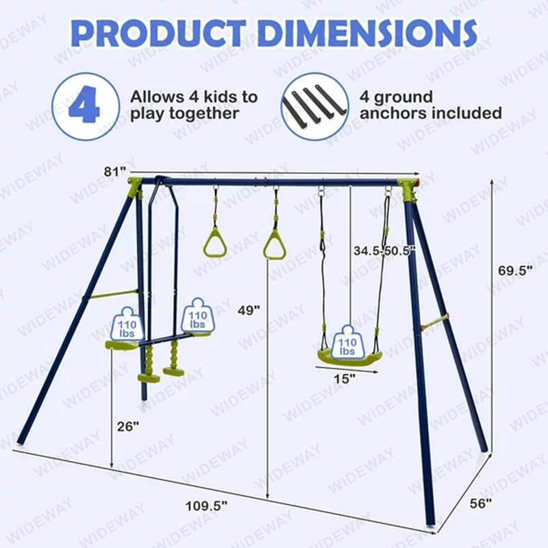 WIDEWAY® компаниясы шығарған 3-бірде-бір балалар әткеншек тірегі W әткеншек 1 әткеншекпен, 1 2 адамдық планермен және 2 жаттығу залы сақинасымен жабдықталған, бұл балаларға арналған әткеншек жиынтығы 4 баланың бірге ойнауына мүмкіндік береді. Күшті бояумен қапталған металл А-тәрізді жақтау өте берік, тот өткізбейтін және ауа-райына төзімді және 440 фунтқа дейін ұстауға мүмкіндік береді. Сонымен қатар, қосымша тұрақтылық үшін 4 жер үсті қосылған. Әткеншектің ілулі арқандарын 34,5''-ден 50,5'' дейін реттеуге болады. Ал U-тәрізді бұрылмалы орындық жайлы тәжірибе ұсынады.